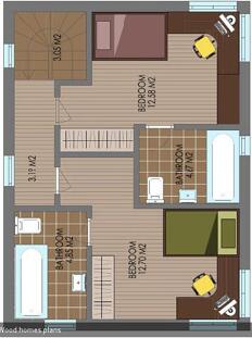 此款木屋設計為兩層樓,木房屋總面積100米²;一個外部車庫加住宅四室和廚房住宅。一樓的生活空間有53平方米,二樓47米²,車庫-