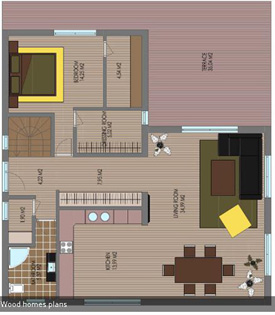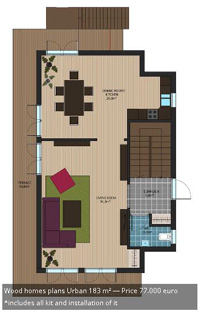 此款木屋設計為兩層樓,木房屋總面積100米²;一個外部車庫加住宅四室和廚房住宅。一樓的生活空間有53平方米,二樓47米²,車庫-