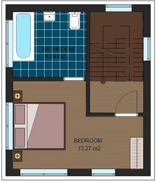 此款木屋設計為兩層樓,木房屋總面積183米²;一樓一個寬敞的內部開放式結構,一樓配備客人衛生間,陽臺和開放的屋頂露臺